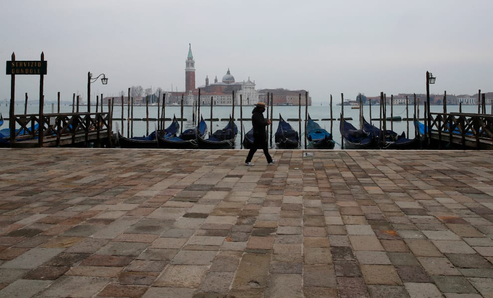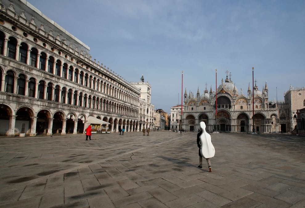 美聯社 / 達志影像在威尼斯,原本人來人往的聖馬可廣場(St. Mark's Square),因為疫情而變得空蕩蕩的。