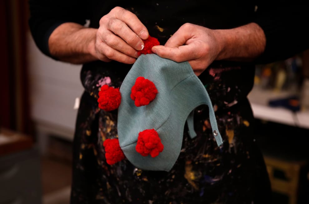 面具店Tragicomico的老闆德拉斯托製作了一個模仿冠狀病毒模樣的帽子。
