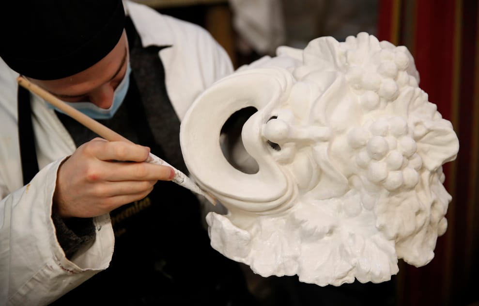 美聯社 / 達志影像面具店Tragicomico的其中一位藝術家,正在為他的作品漆上白色顏料。