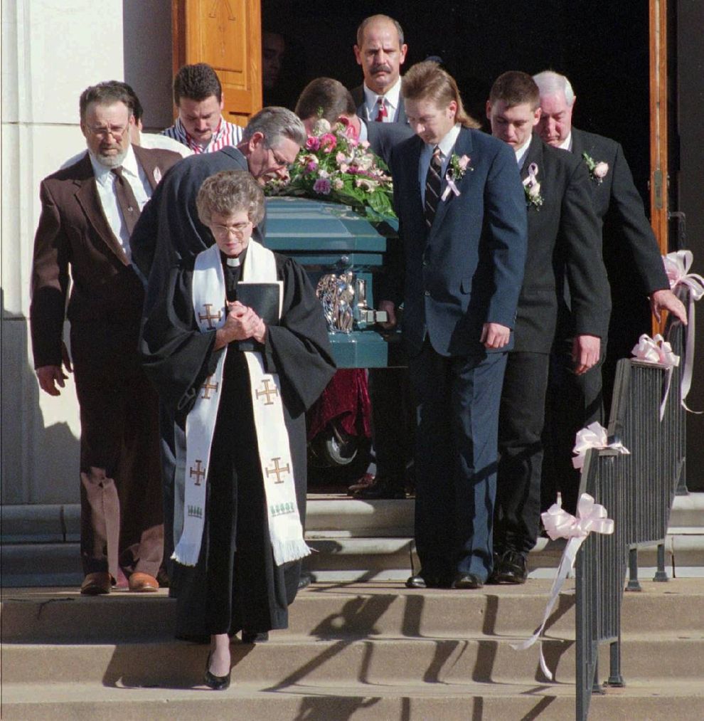 美國會出現失蹤兒童警報,與 1996年安珀撕票案件有關。圖為 1996年1月20日這天,抬棺人抬著安珀的靈柩走出教堂。