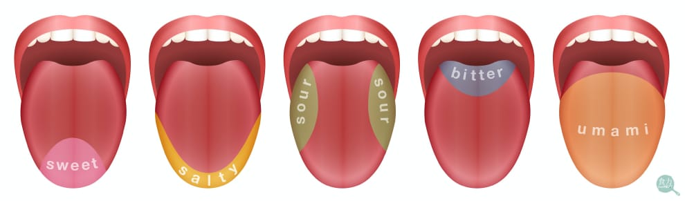 過往學者研究認為大致可以把舌頭的味蕾區域分為如圖的5個部分,但近年研究發現其實並不只是如此。