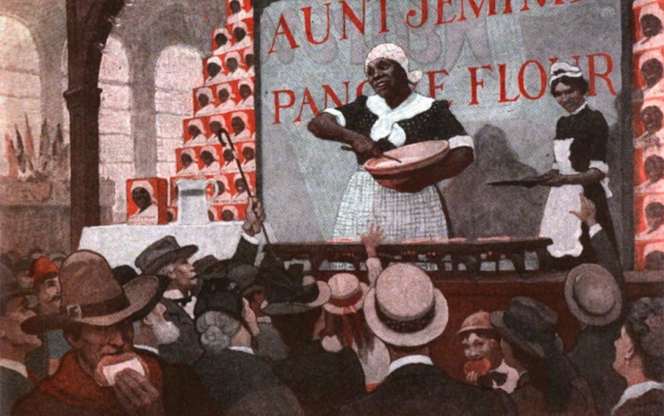 1939 年桂格公司煎餅廣告,紙盒上印製大大的「傑米姨」,角色原型即是黑人姆媽,胖胖身形、身穿白圍裙、戴著白頭巾的黑人奴隸。直到 2020 年,桂格公司才宣布,往後不再使用傑米姨商標。