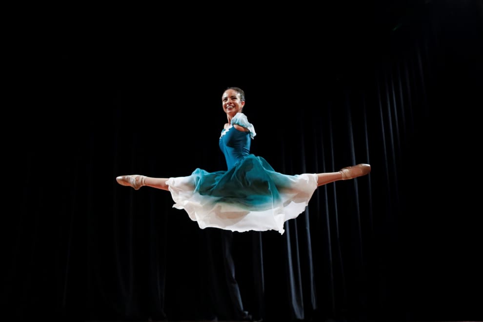 圖為身穿藍綠色舞衣、在舞台上一躍而起的巴西芭蕾少女布埃諾。