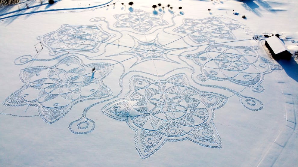 皮寇表示,他之前就有雪地作畫的經驗,但尺寸都是比較小的,這次他則先用電腦設計出結構非常嚴謹的幾何圖形,並用測量和輔助繩去計算圓在雪地上的位置,然後才帶領團隊去「踩」出來。