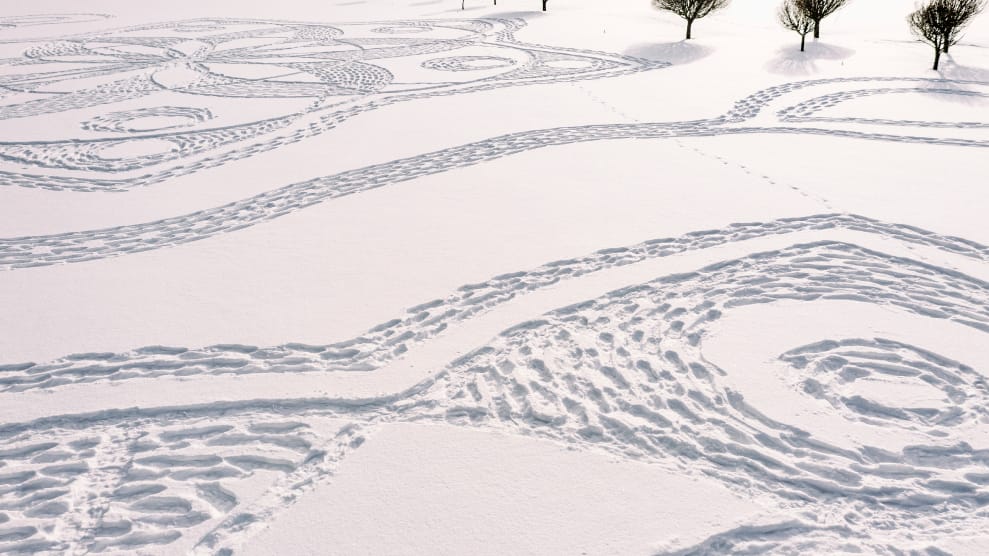 在被大雪覆蓋、看不見一丁點綠色草皮的高爾夫球場,藝術家皮寇和他的十一個夥伴,合力完成了這幅雪地創作。