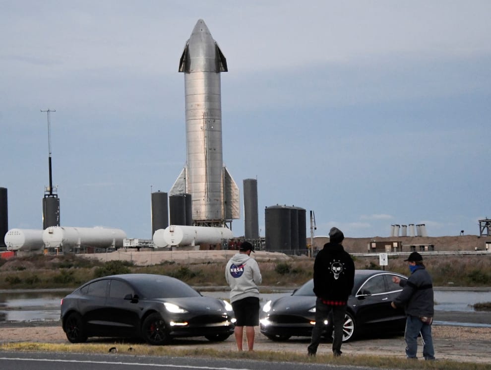 2020年12月4日,特斯拉車主們來到美國德州博卡奇卡村(Boca Chica),看著準備試射的「星艦」火箭。
