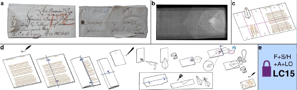 圖為考古學家們用新技術分析編號DB-2040信件所得的成果。圖a是信件正面(左)跟反面(右)的樣子;圖b則是DB-2040信件的X光照片;圖c則是考古學家根據模擬結果繪製出的DB-2040摺痕、筆跡示意圖;圖d則是考古學家依模擬結果推測出的折疊步驟;圖e則是考古學家依據研究成果、折疊手法給予DB-2040信件的分類和保密評分。F+S/H+A+LO指的是信件的折疊手法,LC15是分類編號,淺藍色底和鎖頭表示DB-2040信件的保密等級為中等。