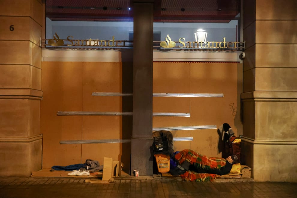在落地窗被打破後,桑坦德銀行(Santander bank)用木板將破口緊急封住。照片攝於 22號。