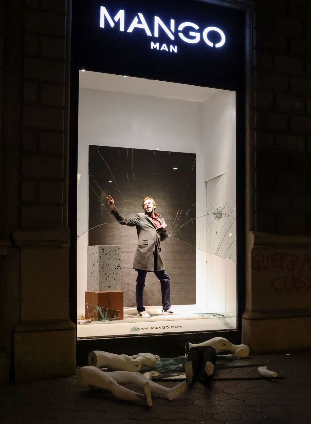 部分群眾在抗議現場製造混亂,街邊商店的落地窗因此遭打破。一名男子站在櫥窗裡頭擺姿勢,原本擺在裡頭的塑膠模特兒則被擺在了路邊。照片攝於 20號。