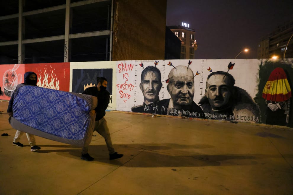 一名加泰隆尼亞的街頭藝術家將現任西班牙國王菲利普六世(King Felipe VI)、前任國王胡安·卡洛斯一世,以及西班牙的最後一位獨裁者佛朗哥(Francisco Franco)畫在牆上,以表達對言論審查的不滿。照片攝於 21號。