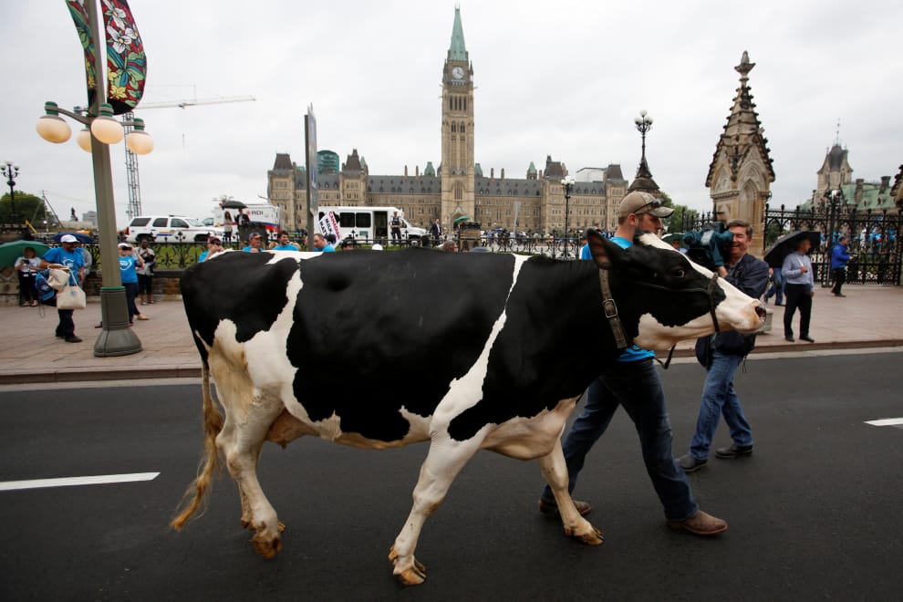 加拿大政府長期補貼酪農業,透過關稅增加國外乳製品進口門檻,藉此維持國內乳製品的價格穩定。圖為一隻出現在加拿大國會山莊前的乳牛。