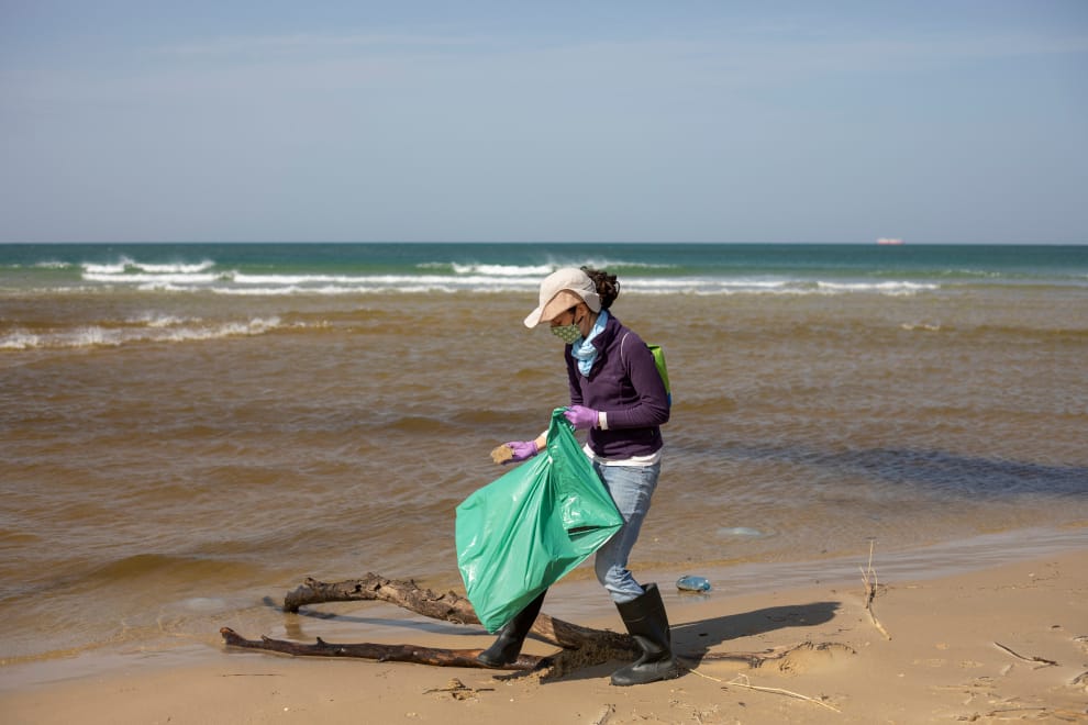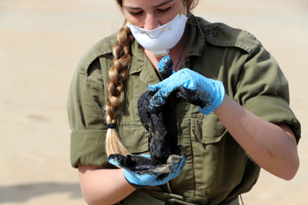 一般民眾和軍警都加入了清理海灘的行動。圖中,一名以色列軍人正從沙灘上撿起一大團的焦油。