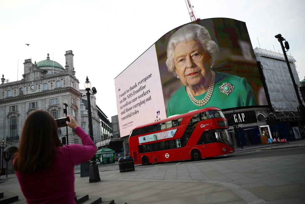 去年四月、COVID-19(武漢肺炎)疫情正嚴重之時,英國女王伊莉莎白二世感謝所有在第一線的醫療服務人員和照護者,她的訊息被放上了倫敦皮卡地里圓環(Piccadilly Circus)的大銀幕上。