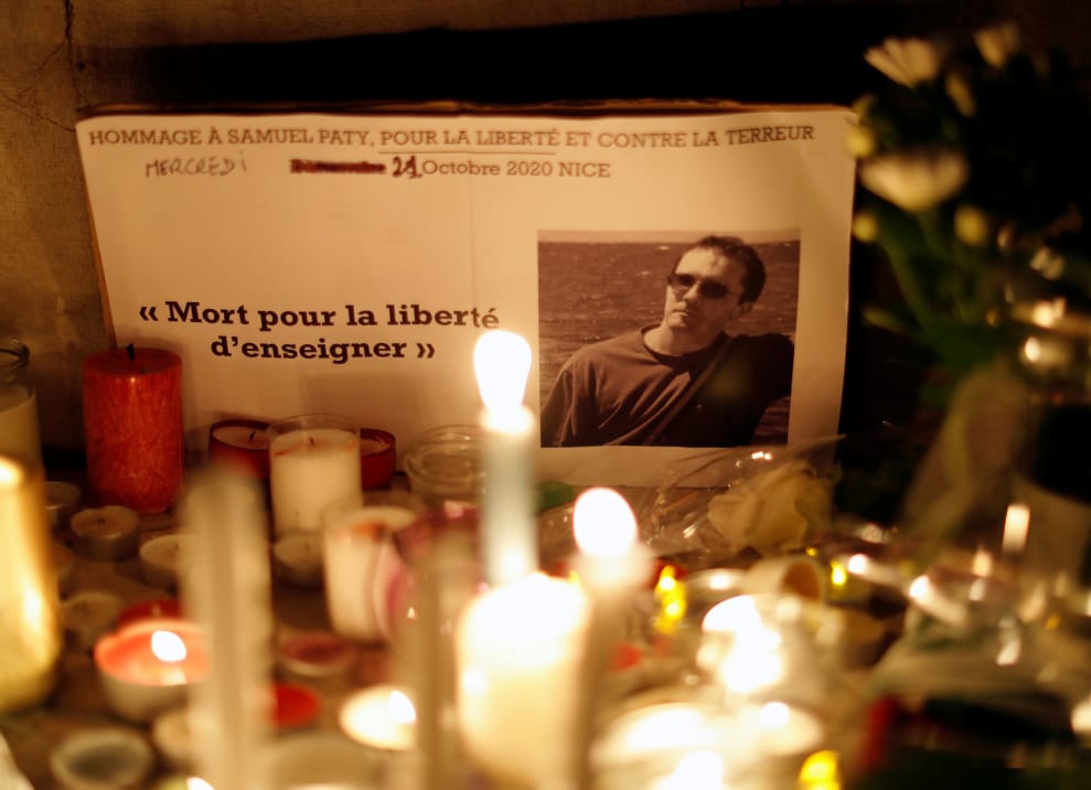 在全國性的紀念活動上,民眾將點燃的蠟燭放在受害老師帕蒂的照片前向他致敬。帕蒂左邊的文字寫著「為自由而死」。本照片攝於 2020年10月21日,在法國尼斯(Nice)。