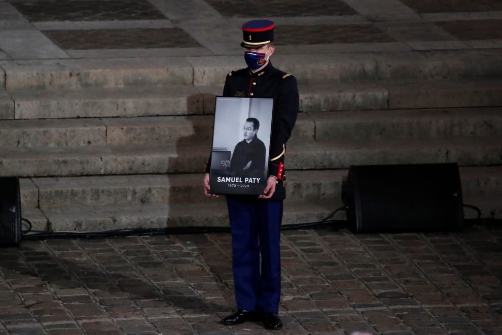 一名法國共和國衛隊的衛兵正捧著帕蒂的肖像,照片一樣攝於巴黎索邦大學的紀念活動。