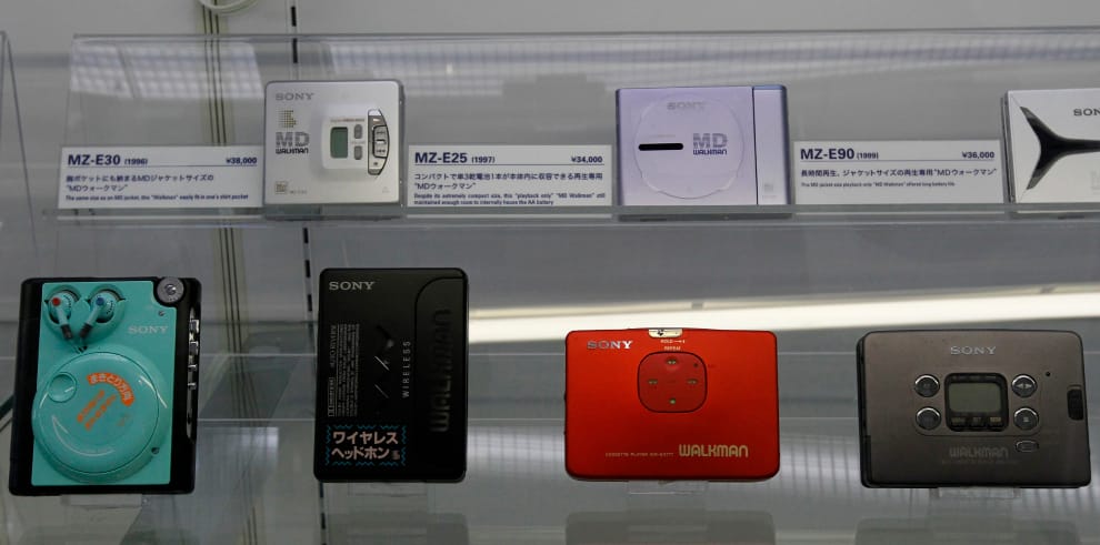 照片中為索尼在 1980和 1990年代時發售的各代 Walkman,攝於索尼位在日本東京的歷史博物館。
