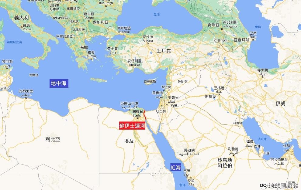 蘇伊士運河(途中紅色河段)位於埃及西奈半島西側,連接紅海和地中海,總長 193公里、深 24公尺。2015年,在埃及總統塞西(Abdel-Fattah el-Sissi)任內完成了蘇伊士運河拓寬工程,能容納載重量超過 25萬噸的超級油輪通過。