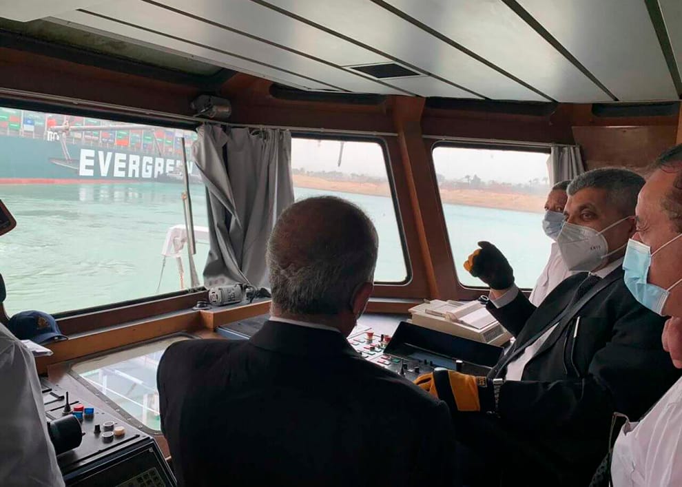在這張拍攝於本月 24號的照片中,可以看到蘇伊士運河管理局人員乘著小船來到長賜號附近,互相討論該怎麼辦。
