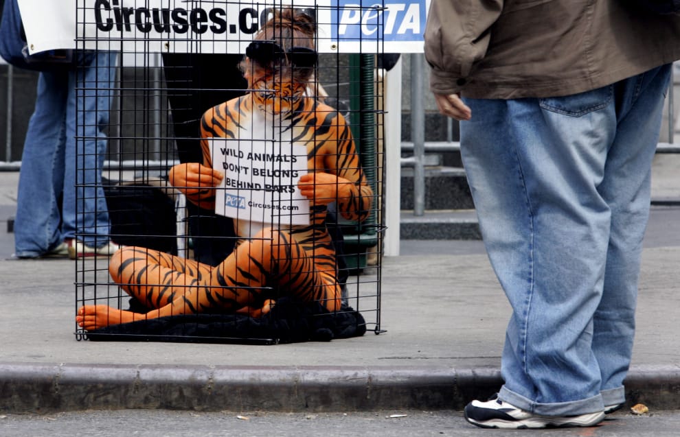 2006年3月,動保人士在紐約街頭打扮成關在籠中的老虎,呼籲馬戲團不要再利用老虎、獅子等動物營利。