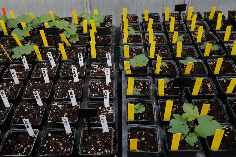 在實驗室裡,科學家已經將自太空返回地球的葡萄藤(黃色標記)移入小盆栽中栽種,等著看它們的基因是否因為進入太空而產生變化。