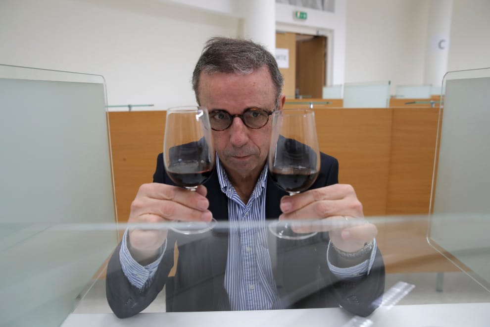 在試飲會上,法國波爾多市的市長赫爾米奇(Pierre Hurmic)凝神盯著手上的兩只酒杯,比較裡頭紅酒的色澤差異。