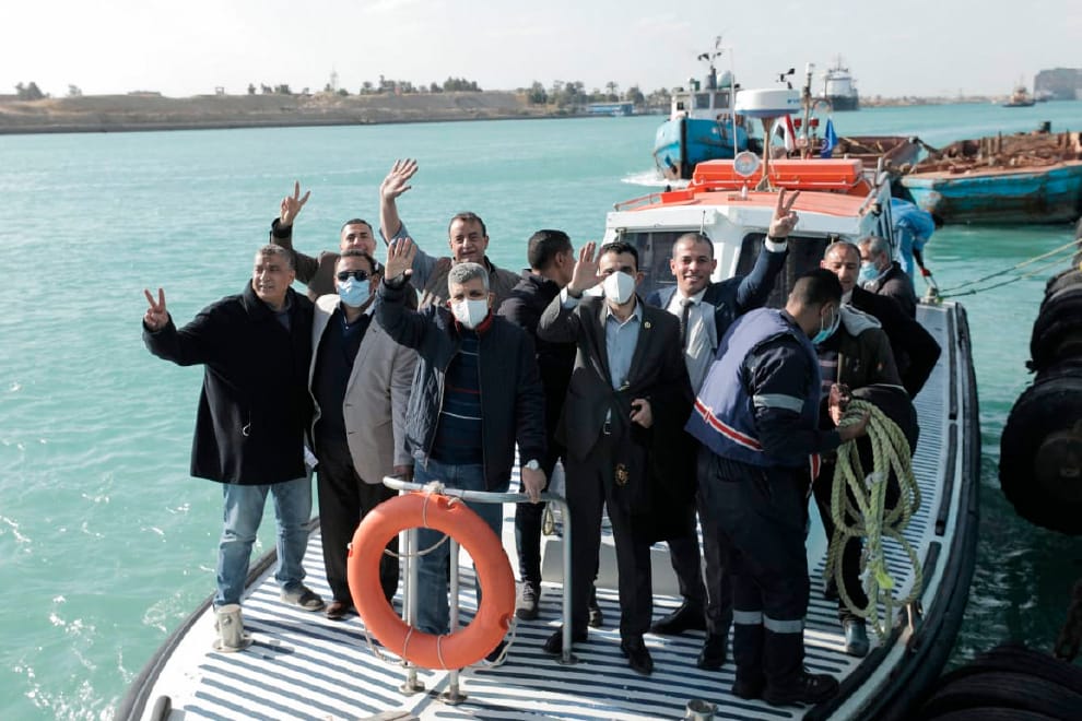 在小船上親眼目睹長賜號脫困的蘇伊士運河管理局人員,開心地朝鏡頭揮手。