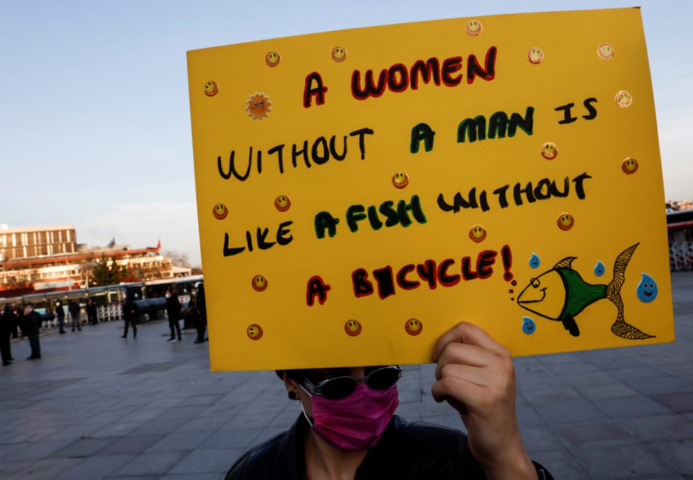 在土耳其宣布退出《伊斯坦堡公約》之後,許多女權及人權團體走上街頭抗議。畫面攝於本月 2號,示威人士在伊斯坦堡舉著手繪看板,上面寫著「沒有男人的女人,就像沒有腳踏車的魚」。