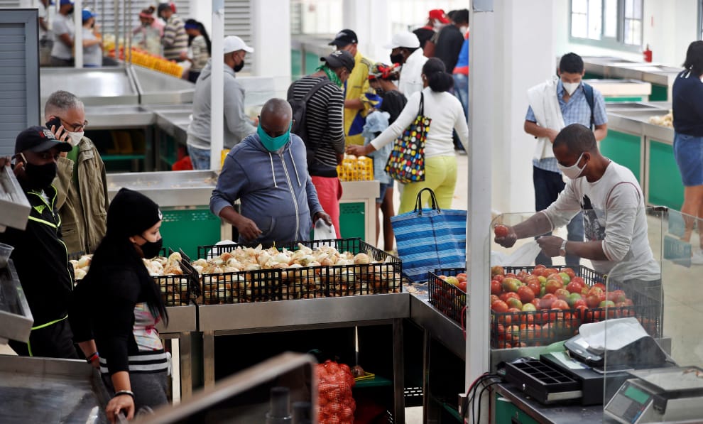 在首都哈瓦那的一間市場內,人們正在挑選新鮮蔬果。因為要遵守防疫規範的關係,同一時段開放進入市場的人數有限。