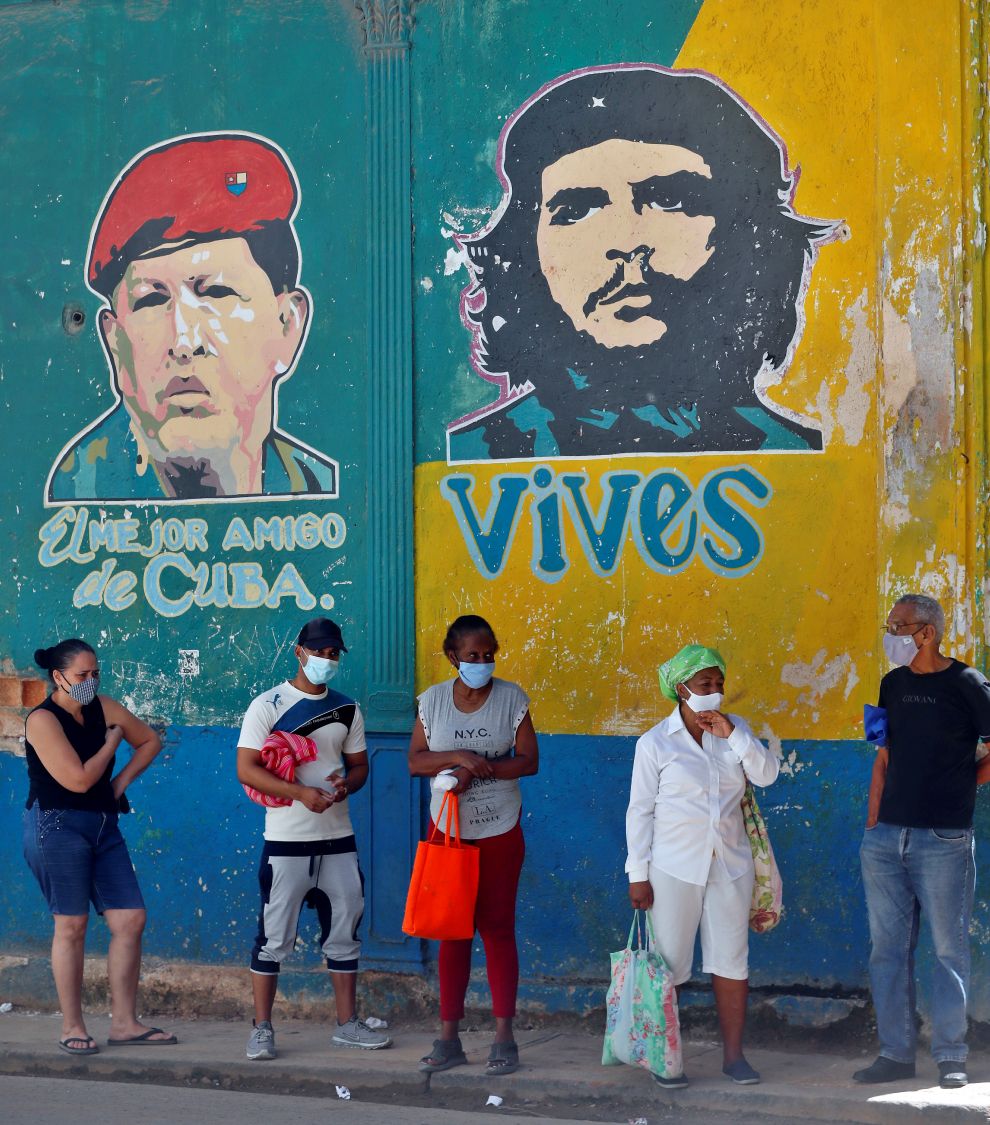 在首都哈瓦那一面繪有前委內瑞拉總統查維茲(Hugo Chavez,左)和古巴核心革命人物切格瓦拉(Che Guevara)的壁畫下,人們正在排隊等待買日用品。