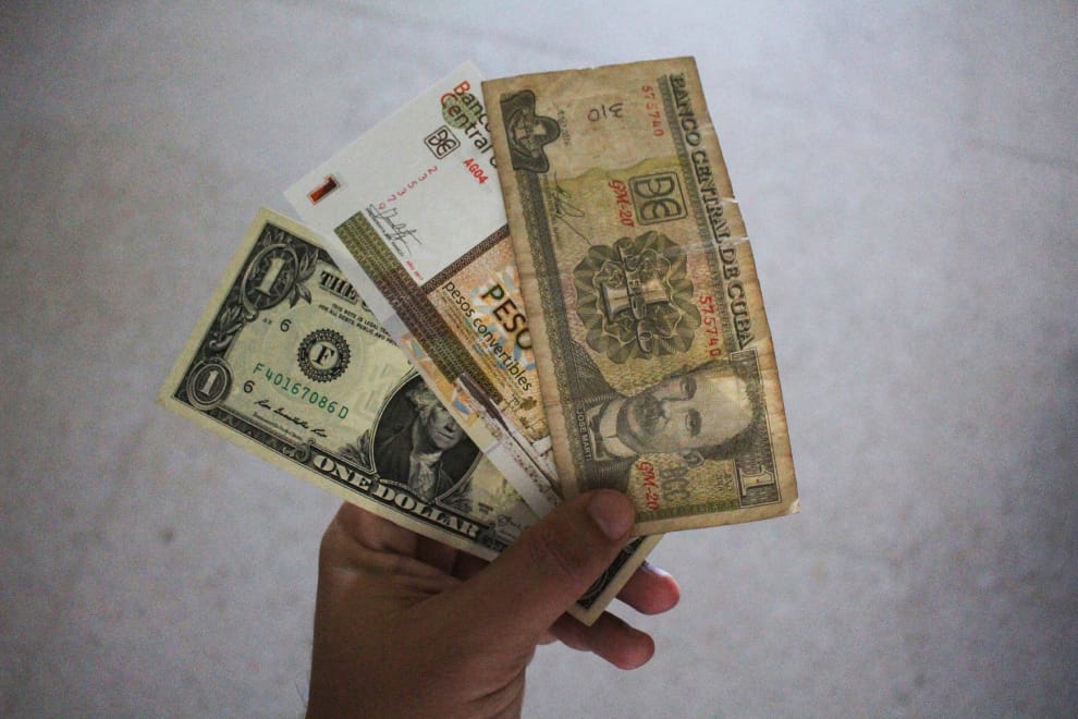 一名男子由右到左手持 1「古巴披索」、1「古巴可兌換披索」和 1美元鈔票。目前,古巴政府已經宣布結束雙貨幣政策,停用「古巴可兌換披索」。