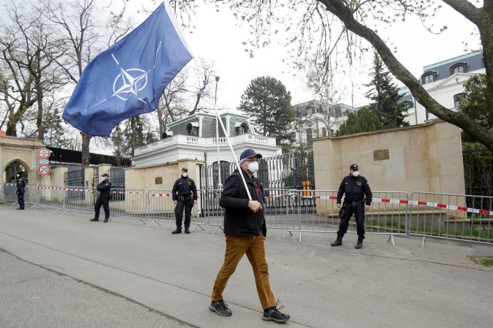 在雙方發生外交衝突後不久,俄國駐捷克大使館外已經湧現示威人群,一名男子也扛著一面北約組織的旗幟來到現場。