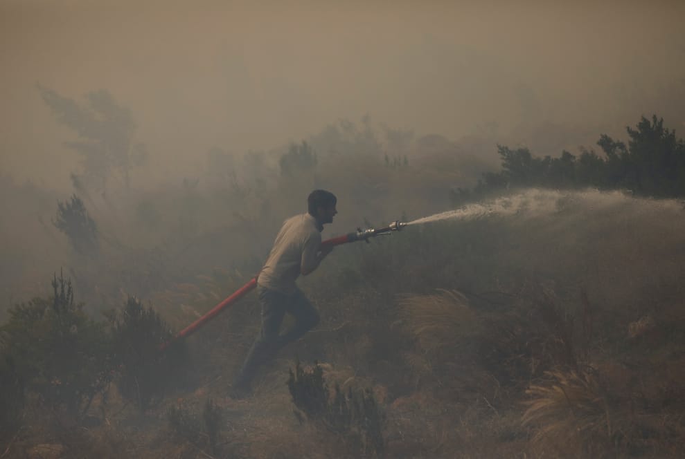 一名民眾正在桌山的山坡上嘗試灑水控制火勢,周圍的視線因為濃煙而模糊不清,照片攝於本月 19號。