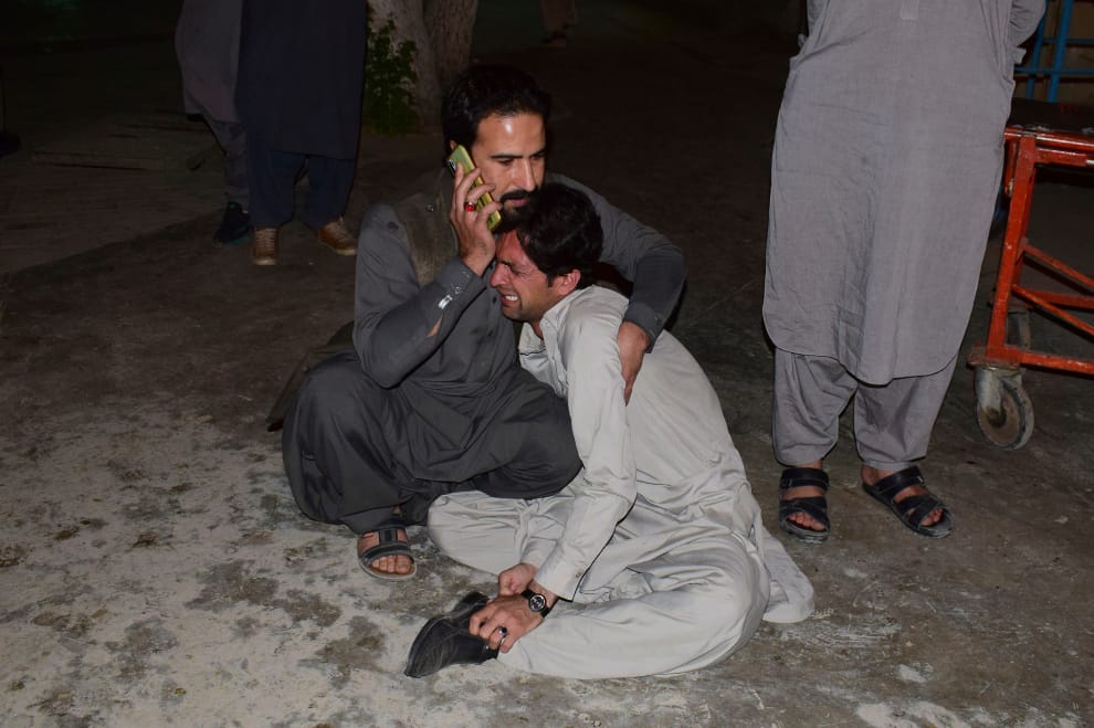 在醫院內,家人不幸於爆炸中死去的男子正在放聲哭泣,另一人在一旁安慰他。