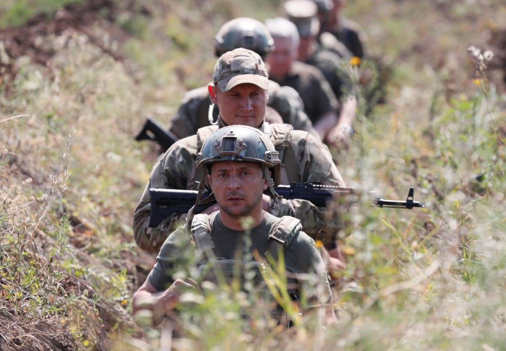 路透社 / 達志影像在俄國大軍壓境的情況下,烏克蘭總統澤倫斯基自然備感壓力,他在向盟友求援之餘,甚至邀請俄國總統普亭親自到烏克蘭東部邊境現場會談,讓雙方就地解決紛爭。圖為去年 8月,澤倫斯基親自戴上鋼盔,走進烏克蘭於頓內次克地區的戰壕視察時的照片。