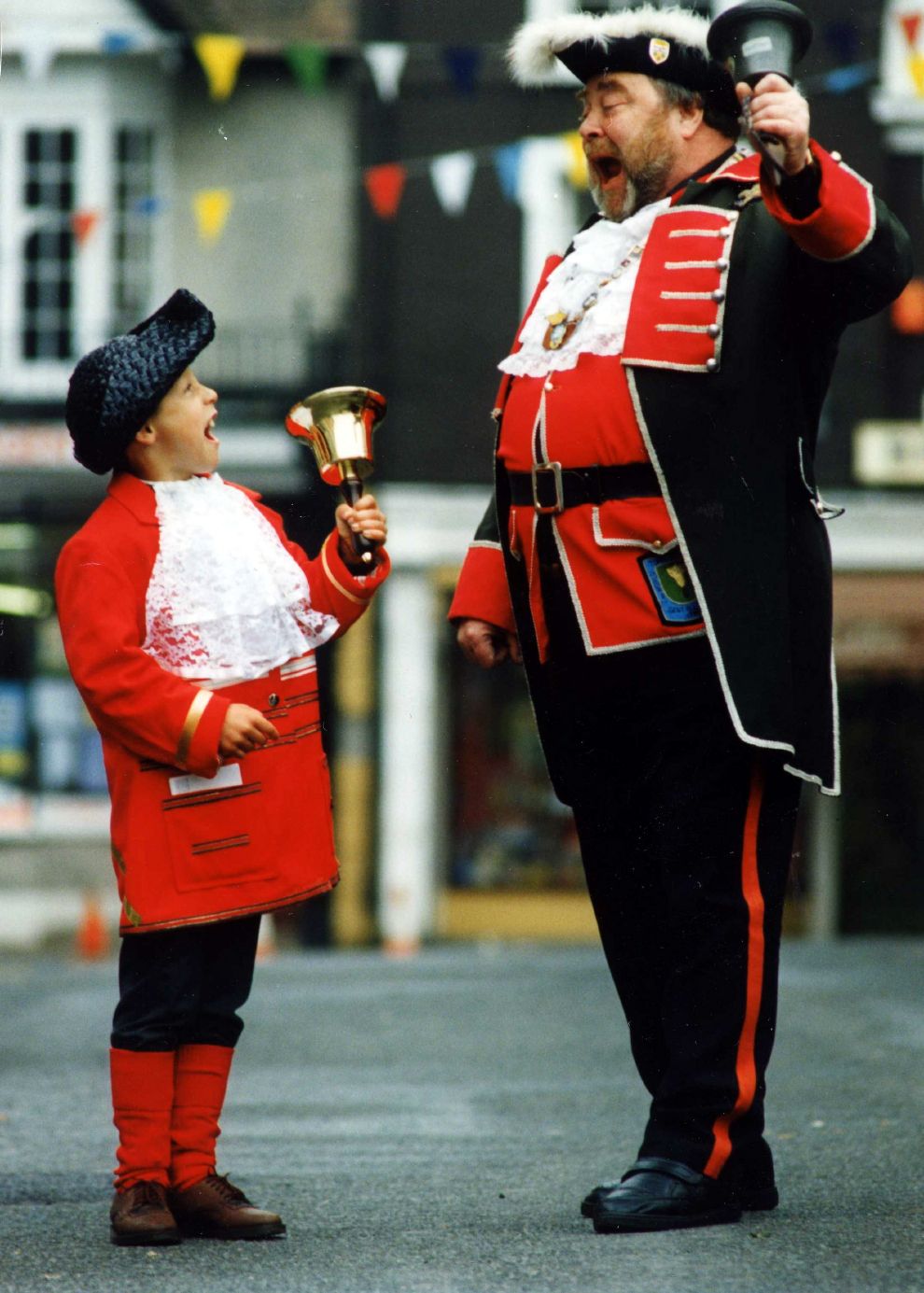 在今年不比音量、咬字,只比公告內文的賽制底下,那些嗓音特大、經驗特別豐富的街頭公告員們,如今也與新入行的街頭公告員們站在同一條起跑線上。圖為 1995年的英國街頭公告員大賽一隅,左邊是英國西南部藍達夫里鎮(Llandovery)年僅 8歲的少年街頭公告員米卡列夫(Luke Micallef);右邊則是英國西威爾斯地區屯貝鎮(Tenby)的街頭公告員托馬斯(John Thomas)。