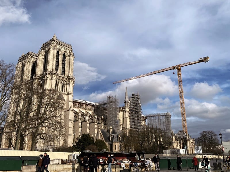 巴黎聖母院右側遠景,吊臂隨伺在旁,外牆安裝上新的鷹架。(中央社曾婷瑄)