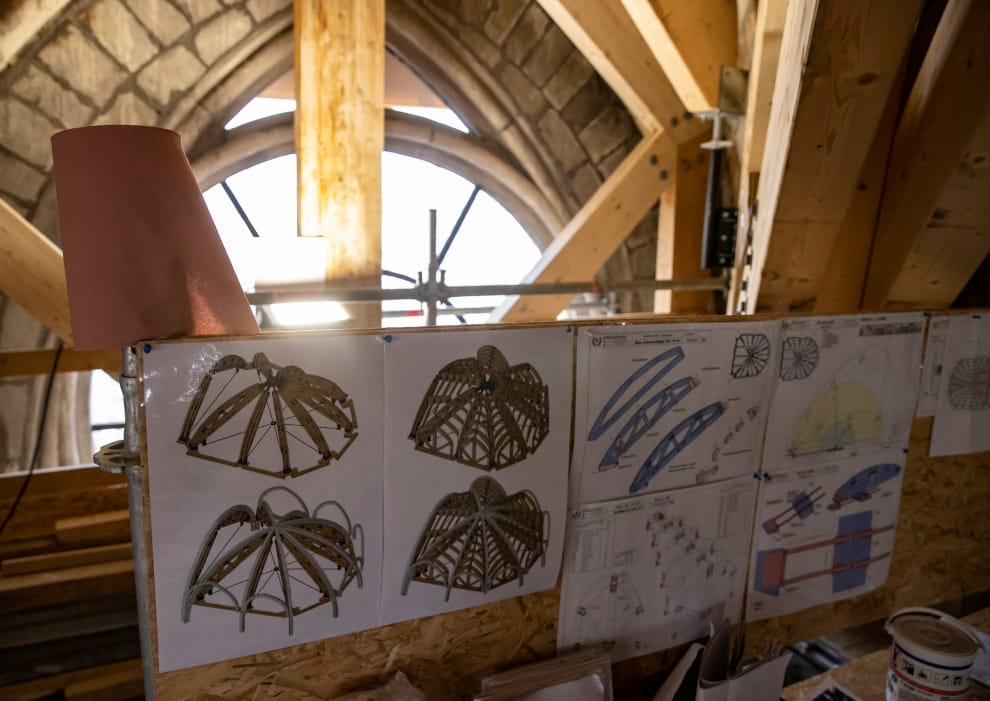 接著,教堂兩側搭起新的鷹架與長板,並運進五組每組1.5噸、特別訂製的木製穹頂下方加固支撐機制,以確保之後尖塔施工時屋頂承重無虞。