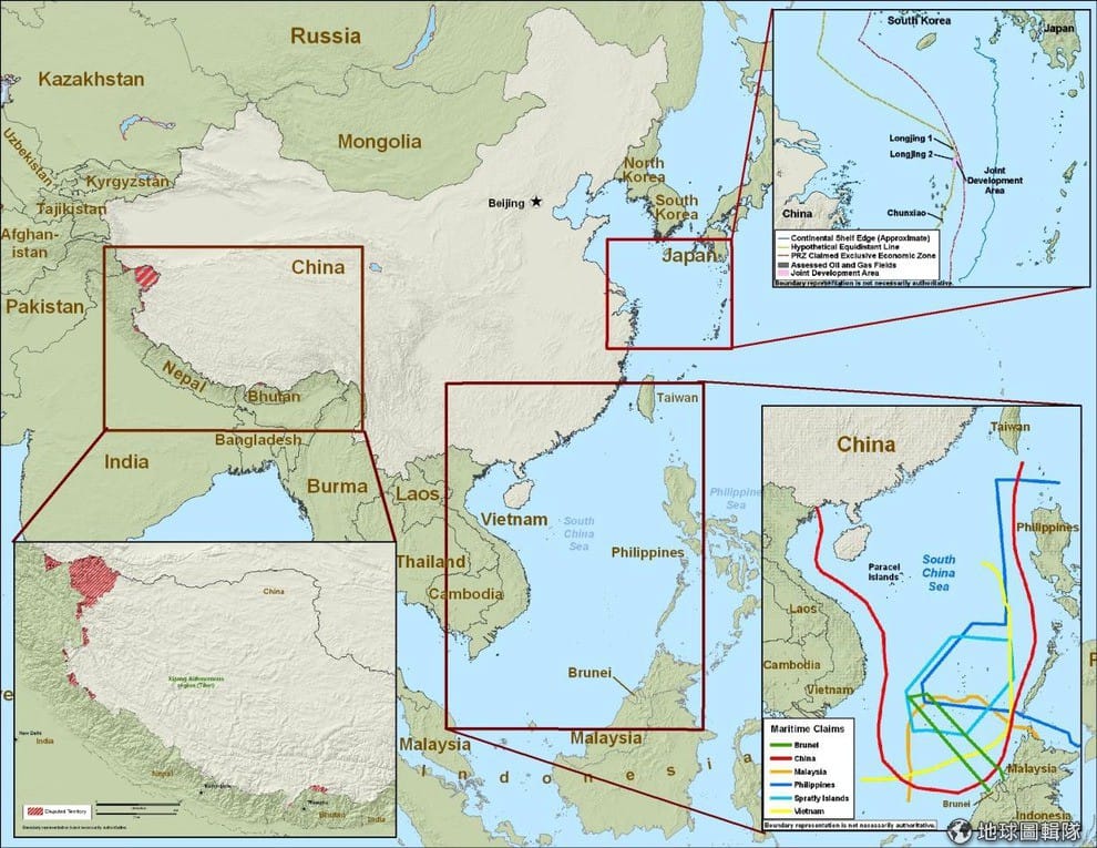 美國國防部提供的地圖中,可以看到中國與各國之間的領土爭議 (photo credit :wikicommons)