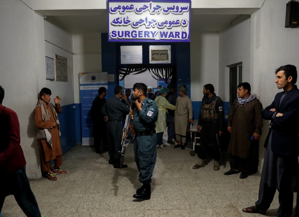 一名阿富汗警察在醫院裡進行維安。