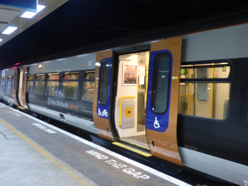 照片為西米德蘭列車的車廂,攝於伯明罕(Birmingham)的伯明罕新街站(Birmingham New Street)。