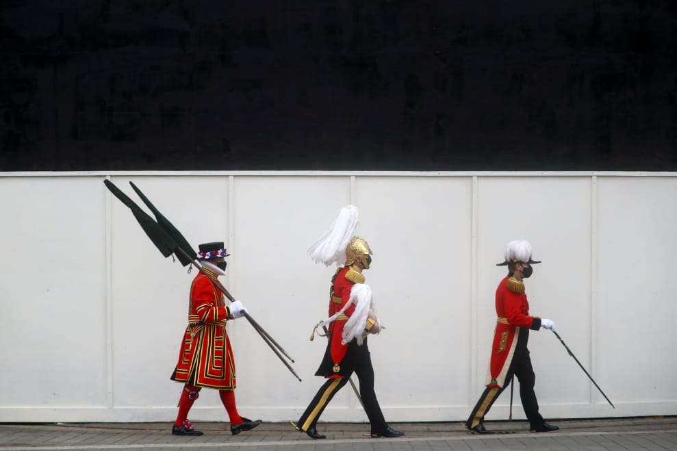 英國在過去一年多以來經歷了艱辛的抗疫時期。照片為倫敦西敏寺(Palace of Westminster)外戴著口罩執勤的皇家守衛,攝於今年 5月11日。