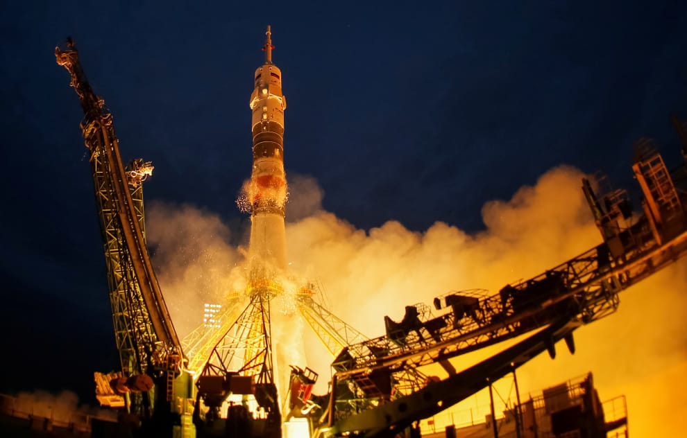 聯盟MS-15載人太空船(Soyuz MS-15)於哈薩克的拜科努爾太空發射場發射升空,準備前往國際太空站,照片攝於 2019年9月25日。