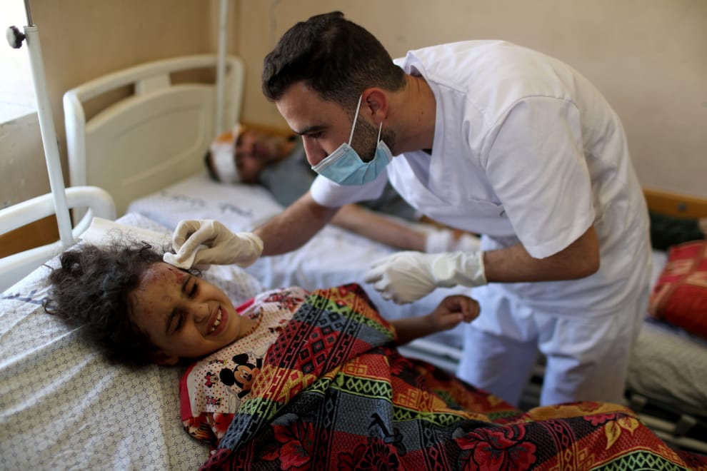 上周日,以色列趁著夜色發動空襲,導致超過 40人死亡,成為衝突至今傷亡最慘重的一日。圖中的醫生正在為今年 6歲、剛從倒塌的建築底下被救出的小女孩埃什昆塔納(Suzy Eshkuntana)擦拭傷口,後方的灰衣男子則是她的父親里亞德(Riyad Eshkuntana)。