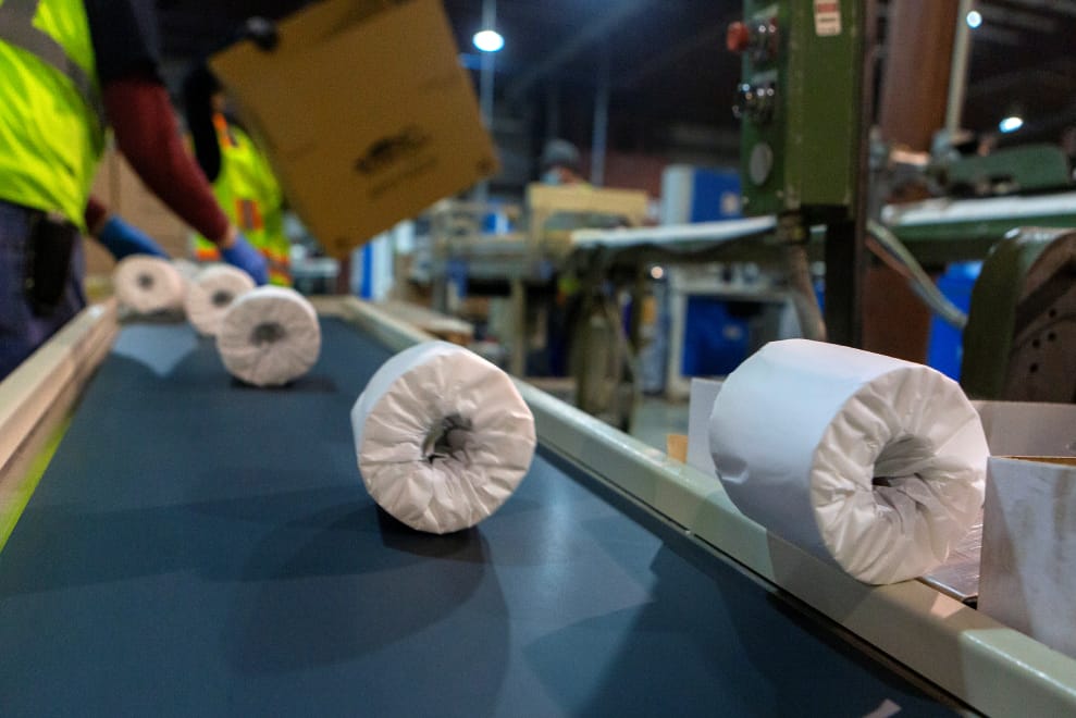 部分專家指出,比起容易腐敗的食物,沒有過期問題的衛生紙明顯成為十分具吸引力的囤貨對象。圖為去年美國發生衛生紙搶購潮後,衛生紙工廠趕工生產衛生紙的畫面。