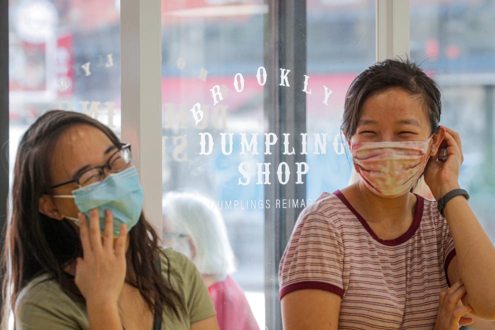 路透社 / 達志影像顧客戴著口罩在布魯克林餃子店內等待餐點,表情開心。
