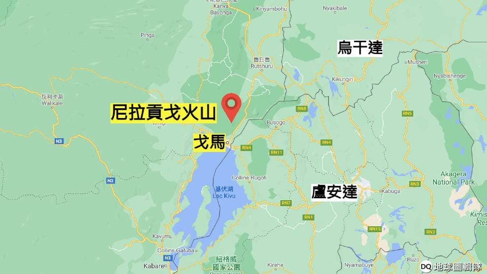 尼拉貢戈火山(紅色地標處)噴發後岩漿一路南下,差點燒進大城戈馬。