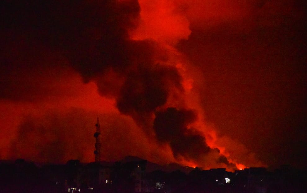 一名隨家人一起逃難的男孩正看著天空中的煙霧和火光。