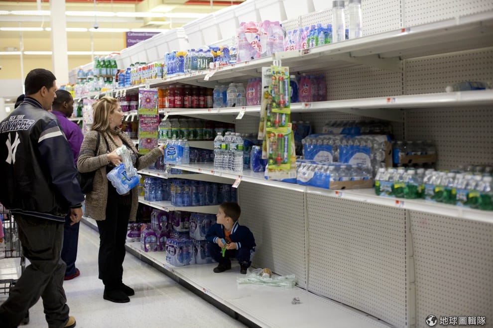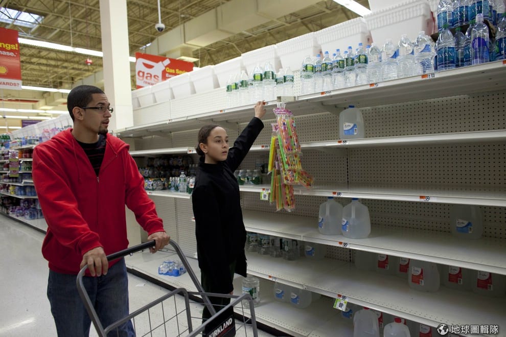 瓶裝水的貨架區快被掃空!圖片來源:Allison Joyce/Getty Images