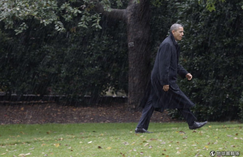總統歐巴馬在大雨中搭機返回白宮坐鎮。圖片來源:Joshua Roberts-Pool/Getty Images