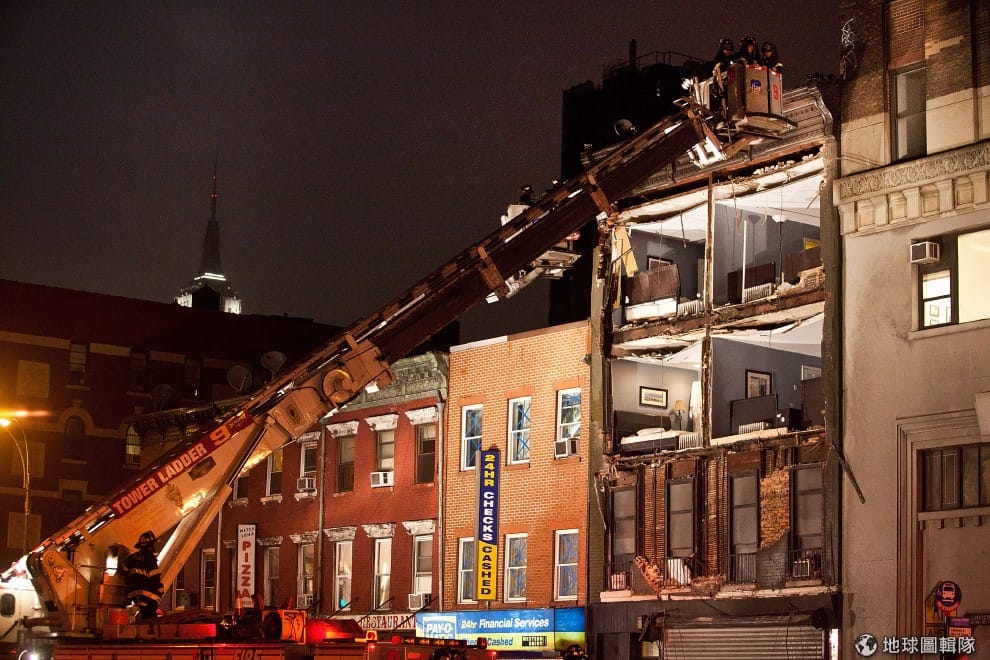 紐約地區的一棟公寓因為具風的強風豪雨而倒塌,消防人員正在全力搶修和撤離居民。圖片來源: Andrew Burton/Getty Images